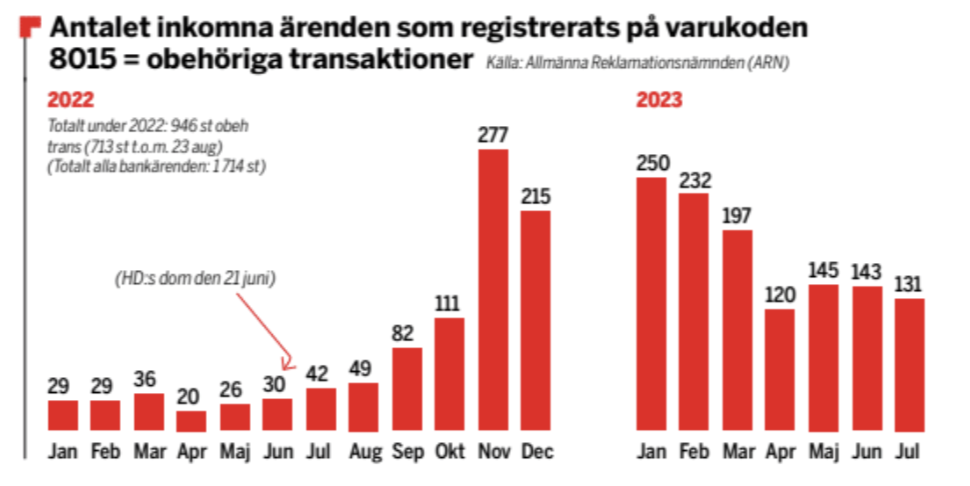 Allmänna reklamationsnämnden (ARN) listar dylika bankbedrägerier under rubriken ”obehöriga transaktioner”. I början av 2022 låg antalet sådana på mellan 20 och 40 i månaden, men under hösten började de klättra och nu ligger de kring 200 i månaden (se graf).