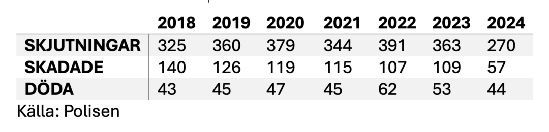 2018 började polisen föra tillförlitlig statistik på området. Sedan dess har skjutningarna varje år legat över trehundra, antalet skadade över hundra och dödsfallen mellan 43 och 62. Fram till förra året. Visserligen låg dödsskjutningarna inom det vanliga intervallet, men antalet skottlossningar och skadade har minskat påtagligt. Och den viktigaste siffran är inte dödsfallen i sig, utan summan av dödsskjutningar och skottskador, säger Granath.