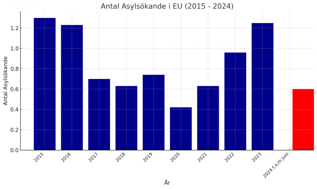 Men EU:s nya migrationspakt kan drastiskt förändra situationen. Med ett asyltryck på 1,1 miljoner till EU under 2023, vilket är den högsta siffran sedan flyktingkrisen 2015, kan Sverige snart tvingas ta emot betydligt fler asylsökande än vad man räknat med framöver. Trenden över antalet asylsökande har nämligen stigit stadigt sedan 2020 och ser ut att hamna en bit över miljonen även 2024, inte långt från rekordåren 2015-2016. (Se graf)