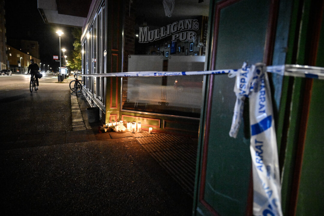 Ljus och blommor vid platsen där två män mördades i en skottlossning i september. Foto: Henrik Montgomery / TT