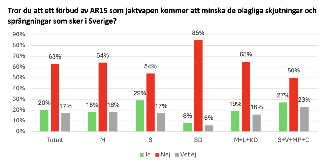 Svaren skiljer sig en del mellan partierna. I Sverigedemokraterna svarar hela 85 procent nej medan bara åtta procent tror att förbudet skulle göra nytta. Men inte ens i vänsterblocket, där förhoppningarna på ett AR15-förbud är som högst, tror mer än 27 procent att det skulle hjälpa.