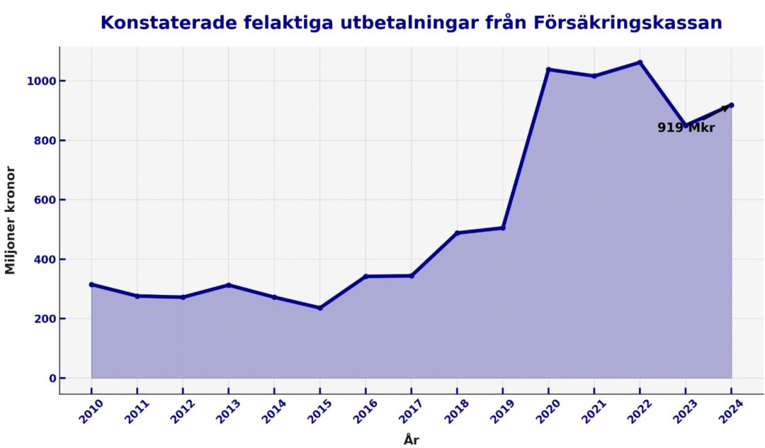 År 2024 betalade myndigheten även ut 900 miljoner till människor som sedan har konstaterats inte vara berättigade till bidraget. Summan av felaktiga utbetalningar började klättra brant uppåt mot slutet av 2010-talet, från strax under 300 miljoner i början av decenniet. Från 2020 har den legat ganska konstant kring 1 miljard kronor varje år.