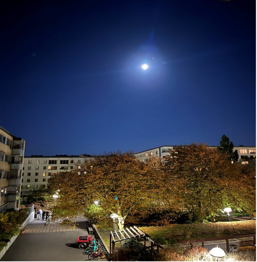 Men det går med lite hjälp. En klar höstnatt ser jag Jupiter och månen från balkongen. Jag tar två bilder. På den första, tagen kl 21.46, den 8 oktober 2022 i sydlig riktning, ser vi månen precis under Jupiter. På nästa bild, tagen två timmar senare, ser vi hur både månen och Jupiter har rört sig västerut (alltså samma skenbara rörelse som solen gör över dagen). Men tittar vi noga ser vi också att månen – i relation till Jupiter – flyttat sig österut. Skillnaden är liten men ändå tydlig.