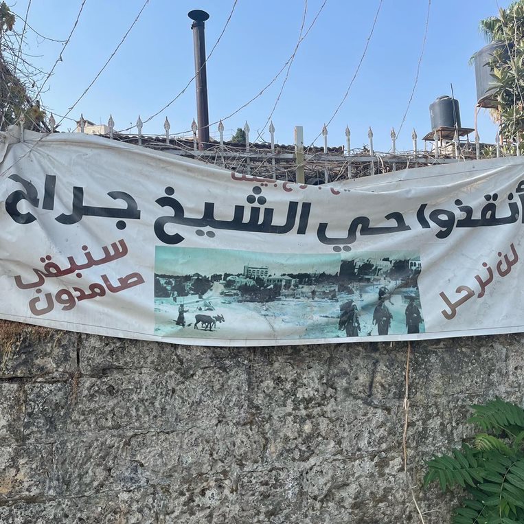 Vi backar i tiden till en septemberförmiddag förra året, några veckor innan det israeliska valet. En banderoll fladdrade till av en lätt vindpust. Runt en bild på åsnor och kvinnor som bär grödor på stora fat på sina huvuden, stod det med arabiska bokstäver: rädda Sheikh Jarrah, vi ska stanna, inte lämna.