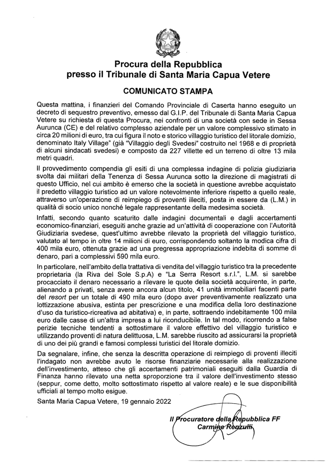 »Genom att använda sig av falska tekniska rapporter med syfte att underskatta värdet på turistanläggningen och genom att använda illegala pengar, kunde [köparen] säkra övertagandet av en av de största och mest kända turistanläggningarna på den domizianska kusten«, skriver åklagaren i ett pressmeddelande.