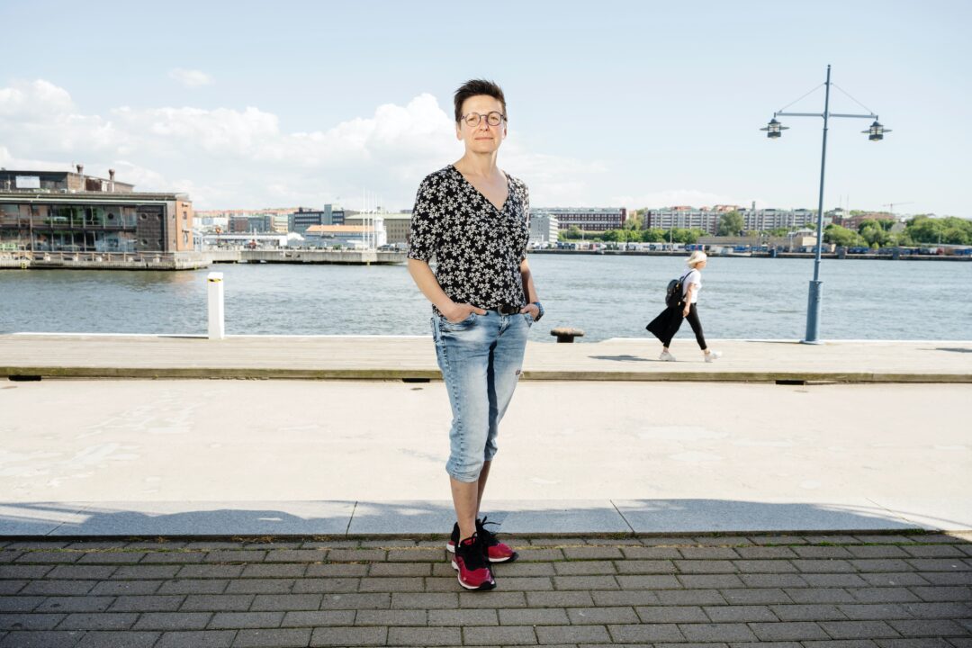 Efter jobbet, en varm junieftermiddag när Göteborg firade 400 år, satt hon på en hård träbänk vid Eriksberg.