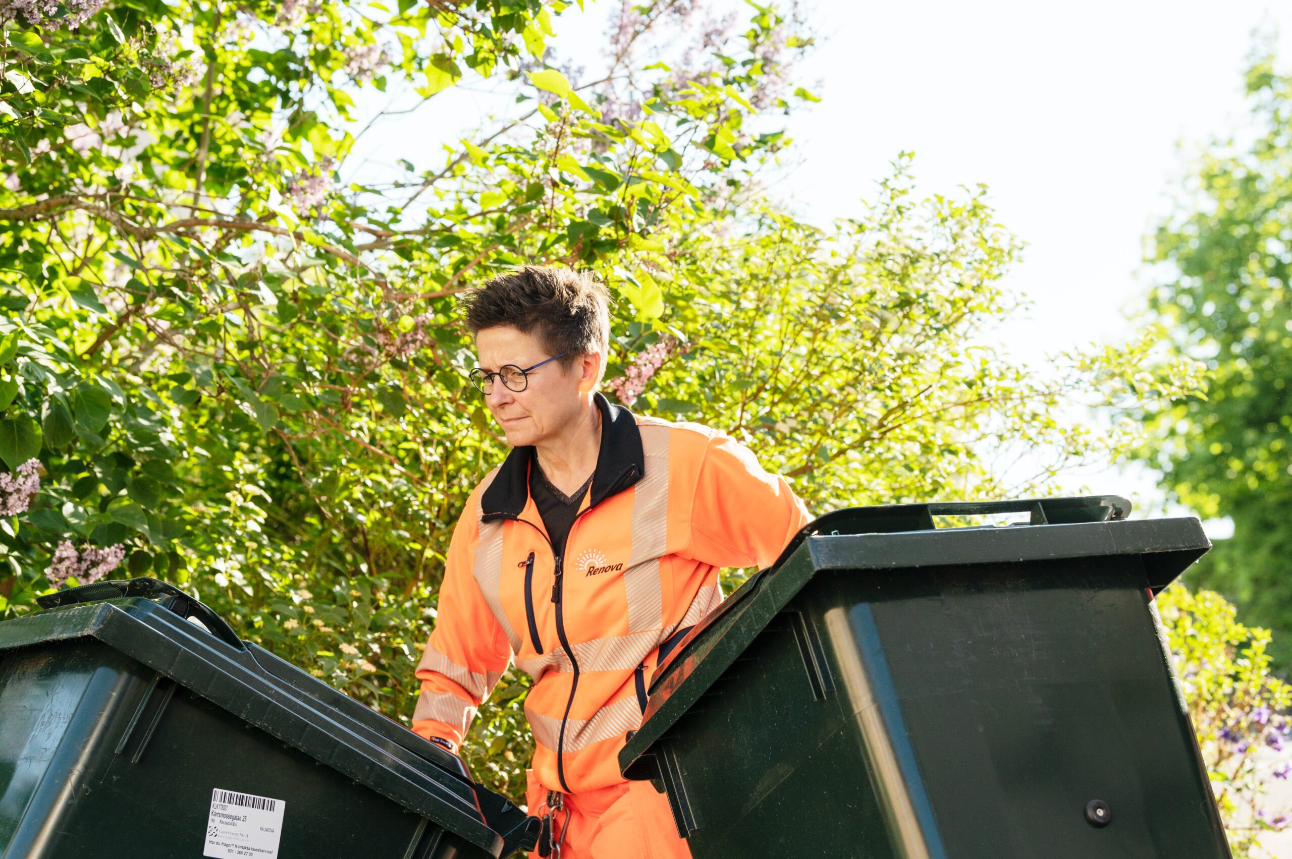 – Nej, allt ligger i speciella kärl. Vi har ett 370-kärl. De är tunga och måste stå vid tomtgränsen. Vi ska bara komma och ta dem, är de inte där tar vi dem inte utan bara registrerar att de inte är där och kör vidare, men på andra kan kunderna beställa dragmeter. Det betyder att de betalar för att vi ska dra kompostkärlen.