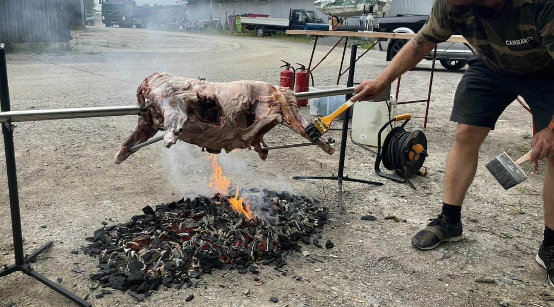 – Någon kan ta oss för EU-migranter, skrattar Jonas som är i full färd med att förbereda grillningen. Han sätter ner en bred målarpensel i en hink med tio liter marinad och staplar upp 25 kilo grillkol.