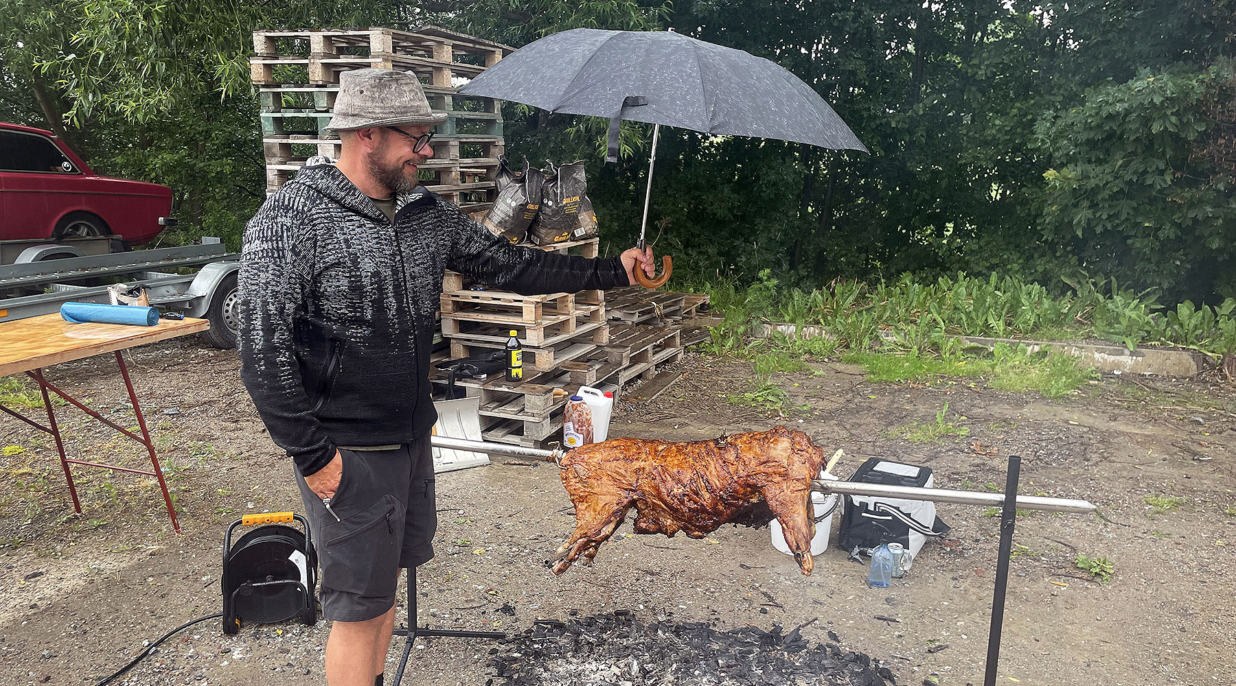 Samtidigt blir molnen över oss mörkare och innan jag hunnit dricka min andra öl öser regnet ner. Jonas hämtar ett paraply som han håller över grisen. ”Bålsta har aldrig någonsin mer sett ut som en Roy Andersson-scen”, kommenterar en följare när jag postar en bild på Twitter.
