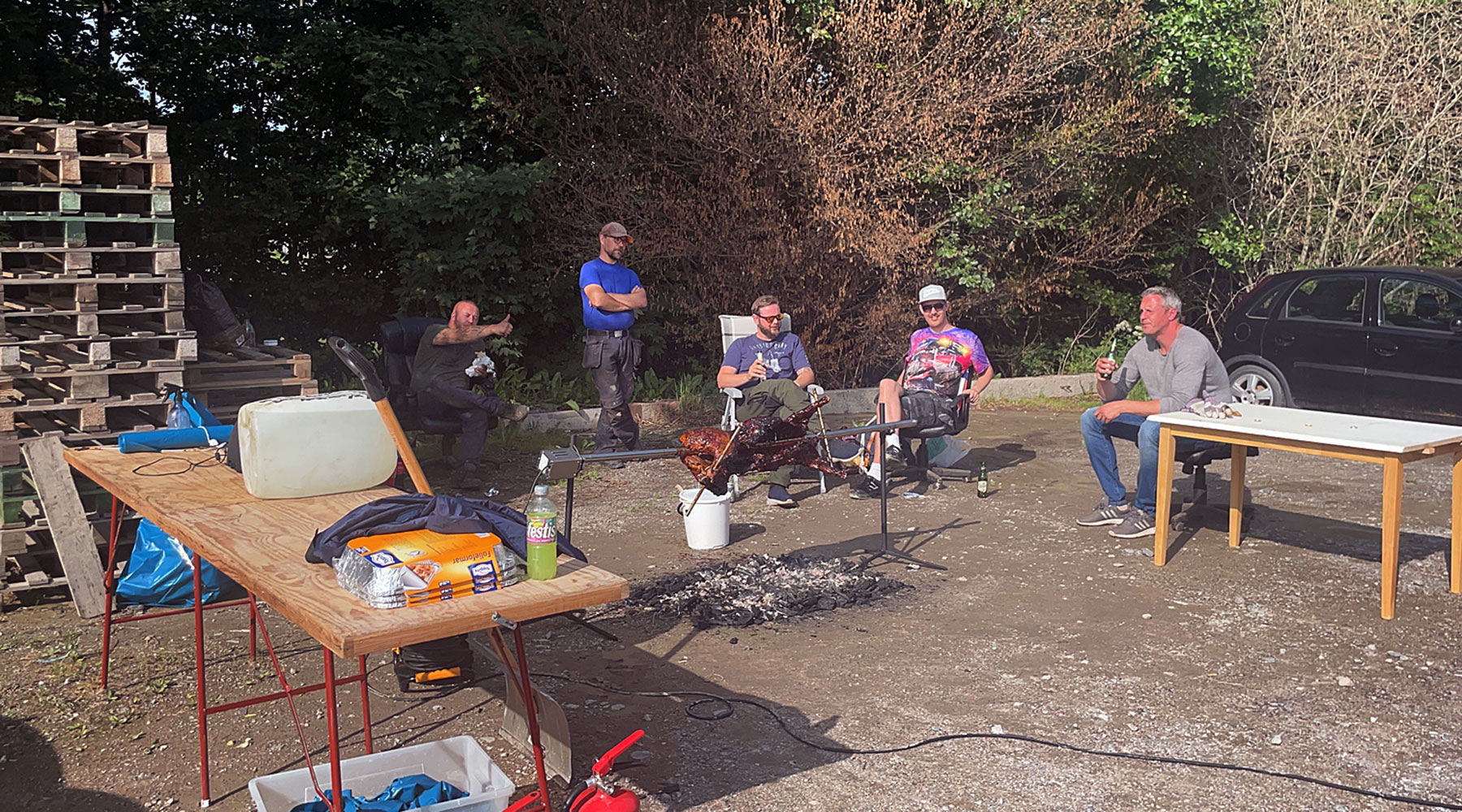 Ett dygn senare sitter vi i Bålsta industriområde med varsin öl i handen trots att klockan knappt slagit lunch. På ena sidan om oss ligger en hög med gamla EU-pallar, på andra sidan står en skrotbil fastspänd på flaket på en lätt lastbil. Vi har fri sikt in i den gamla industrilokal där jag och några vänner brukar mecka med våra raggarbilar.