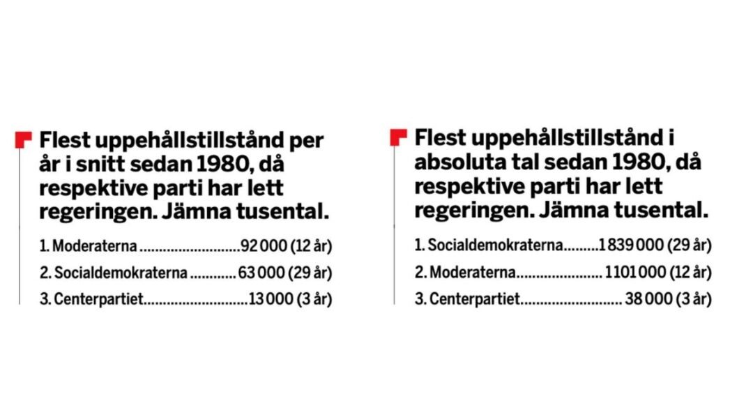 Räknar man däremot genomsnittet per år så intar regeringar med moderata statsministrar en topposition med 92 000 tillstånd per år under sammantaget 12 år. Socialdemokraternas fem statsministrar har ett snitt på 66 000 tillstånd per år under sina totalt 28 år.