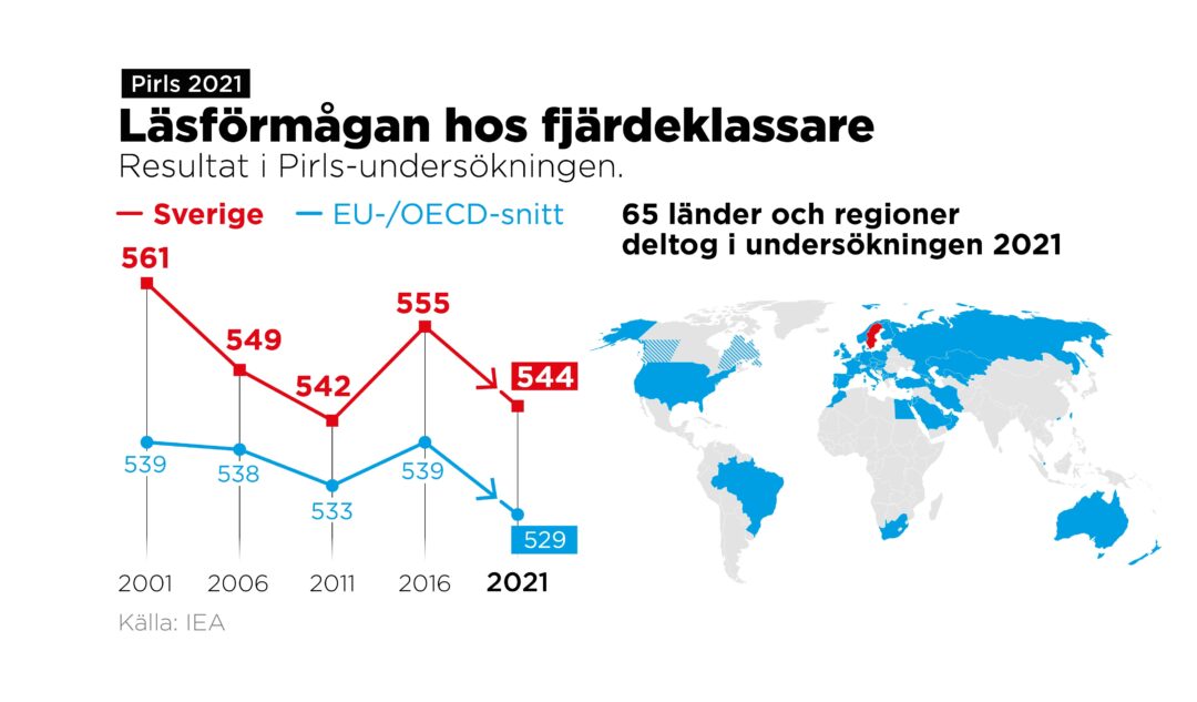 I veckan släpptes resultaten från den senaste omgången av det internationella lästestet Pirls. Proven gjordes under 2021 och de svenska eleverna fick 544 poäng, den näst lägsta svenska poängen sedan testen startade vid millennieskiftet.