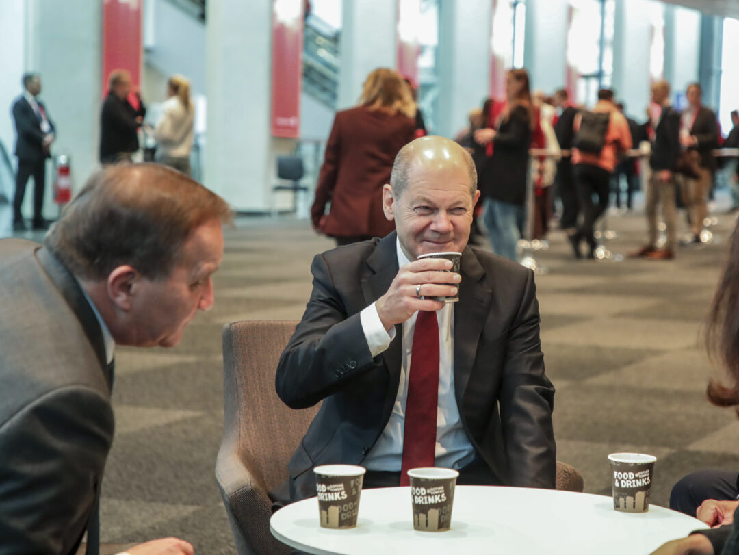 Men allt det här förutsätter att Socialdemokraterna får makten. Till sin hjälp tar man tyskarna och Olaf Scholz, den tyske socialdemokraten som ledde partiet till seger i det senaste valet. Valvinnaren är på besök på kongressen och socialdemokratiska toppar är sugna på att visa upp det. Inför Magdalena Anderssons tal sitter Ann Linde, Hans Dahlgren och Stefan Löfven i samtal med den tyska partiledaren. Kanske är det ett slump att de sitter precis bredvid SVT:s och TV4:s studios.