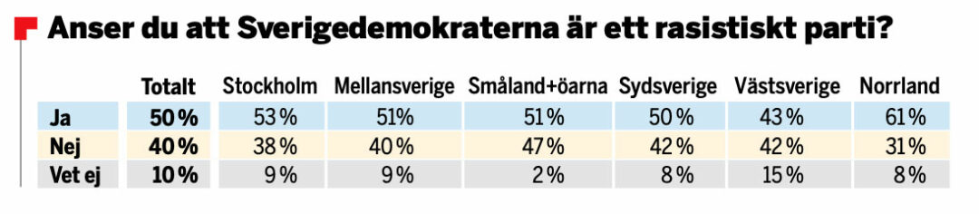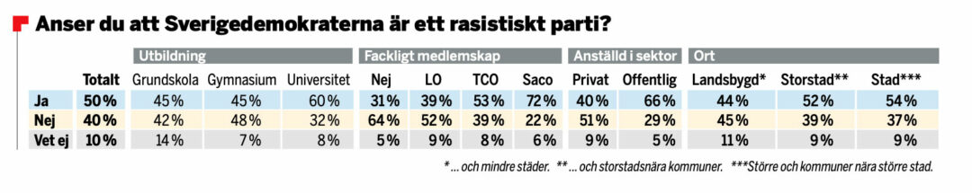 För att utröna hur svenska folket ser på Sverigedemokraterna bad Fokus opinionsinstitutet Novus ställa frågan ”Anser du att Sverigedemokraterna är ett rasistiskt parti?” till ett representativt urval av väljarna. Varannan – 50 procent – svarade ”ja” medan 40 procent svarade ”nej”. Var tionde, 10 procent, svarade ”vet ej”.