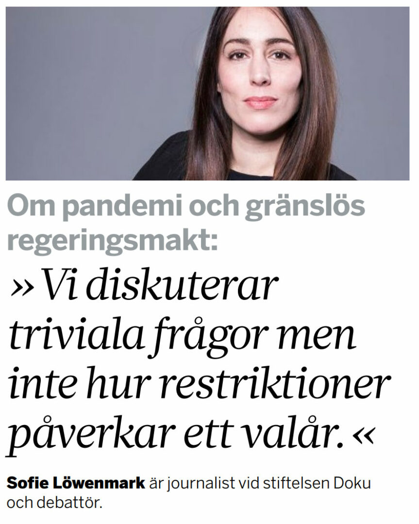 Det är ett fattigdomsbevis för vårt offentliga samtal och vår demokratisyn att det som vi diskuterar är triviala frågor om att det ska vara en meter mellan sittande gäster på restaurang och 500 på varje läktare på idrottsarenor, men inte om och hur restriktioner påverkar demokratin ett valår.