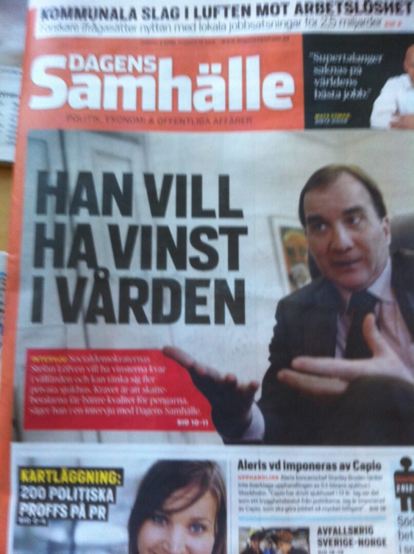 I min telefon har jag sparat en bild av ett omslag på Dagens samhälle, troligtvis 2013, där Stefan Löfven är omslagspojke. Rubriken lyder: ”Han vill ha vinst i vården”.