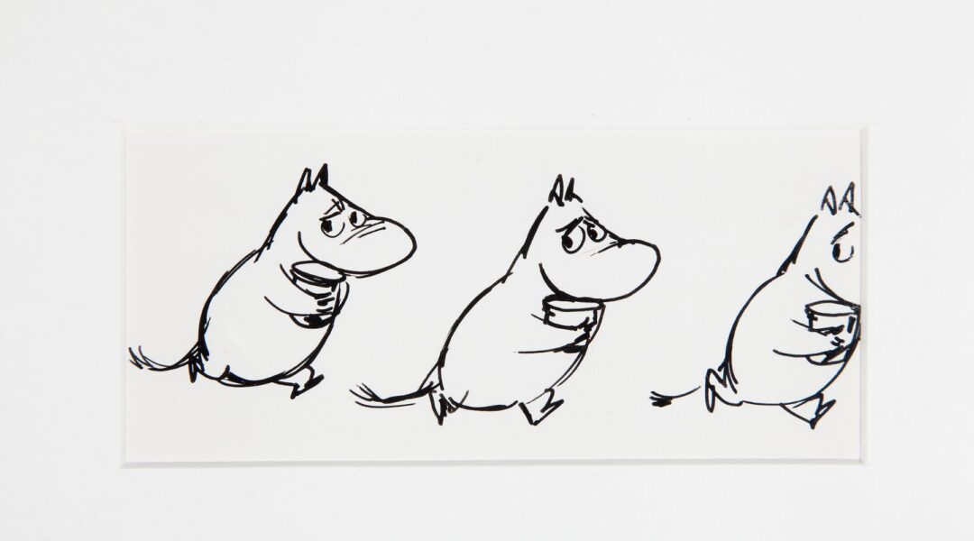 Tove Janssons Mumintrollet fyller nu 80 år och utställningen visar i skisser finlandssvenskans älskade figurers utveckling steg för steg. Inte minst finns här en tidig bild på trollet från mitten av 1930-talet, då när det var en svart figur med röda ögon och ett jättelikt ångestgap, en skrämmande bild av tidens tätnande mörker.