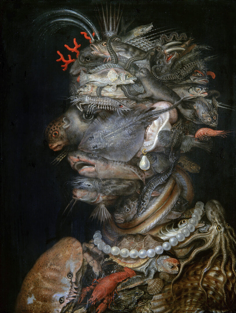 På omslaget ser vi alltså Arcimboldos målning Vatten. Frågar man personer som inte känner till konstnären när tavlan kan vara från säger de att det är en lekfull bild som trotsar konventioner och som därför troligen måste vara modernistisk. Nittonhundratal någon gång. Men Arcimboldo dog för över fyrahundra år sedan, och målningen är från 1566. Så gammalt, och ändå så – alldeles nytt. En massa saker som staplas på varandra. Djur, lagda på varandra, som blir något annat.