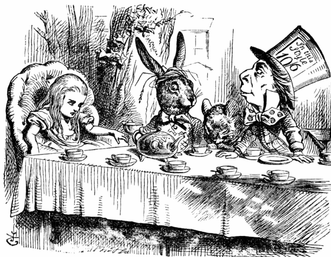 I översättning blir The March Hare ofta just Påskharen, men då går poängen förlorad. Begreppet ”Mad as a March hare” finns belagt i engelskan sedan åtminstone tidigt 1500-tal. Carroll återuppväckte uttrycket och sir John Tenniel gav Marsharen form i bild. Tenniel lade halm på Marsharens huvud, en populär viktoriansk symbol för galenskap.
