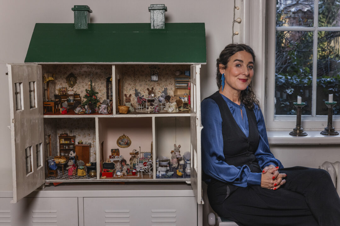 Vi slår oss ner med espressokaffe vid det stora köksbordet. Strax bakom henne får jag syn på ett dockskåp som rymmer omsorgsfullt möblerade rum. Hon förklarar med ett varmt leende att hon ”älskar allting som är litet”, reser sig och öppnar skåpets dörrar.