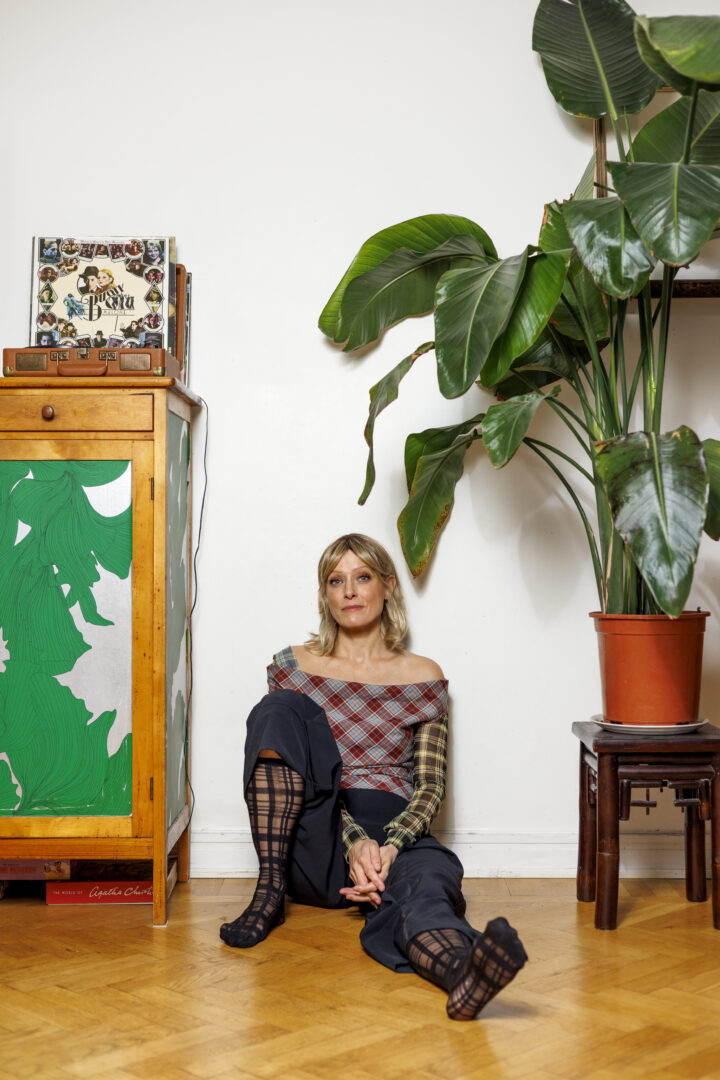 På väggarna i lägenheten samsas filmplanscher med gamla familjefotografier. Ett vitrinskåp är fullproppat med smycken, ”krimskrams” som hon själv kallar det. Intresset för vintage syns överallt, inte minst när det gäller hennes kläder.