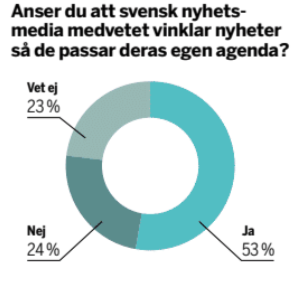 En majoritet av svenska folket uppfattar alltså nyhetsmedia som en politisk aktör som driver sin egen, och kanske även andras, agenda. Av det följer också att man inte anser att medierna fullgör sin roll som folkets granskare av makten och den som rapporterar om samhällsutvecklingen på ett så rättvisande sätt som möjligt. Det betyder inte att det som medierna publiceras uppfattas som lögner, utan att nyheterna ”kureras” så att det gynnar andra intressen än samtliga medborgares. Nyhetsmedia är, för att förtydliga, de som producerar dagliga nyheter riktade till allmänheten via tv, radio, dags- och kvällstidningar. Här bör även påpekas att förtroendet skiljer sig kraftigt mellan dessa kategorier, med kvällstidningar i botten.