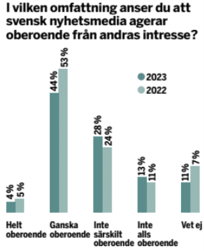 Sedan flera år anser en majoritet av svenskarna (senast 53 procent) att medierna förmedlar en bild av samhället som passar mediabolagens egen agenda. Och endast 4 procent anser att nyhetsmedia agerar helt oberoende från andras intressen, medan 13 procent anser att media inte alls är oberoende. Det är dessutom en snabbt fallande trend, andelen som anser att medierna är ”ganska oberoende” har minskat signifikant på bara ett år från 53 till 44 procent.