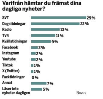 Samtidigt tar 95 procent av svenskarna till sig nyheter varje dag de primära källorna är SVT (25 procent), dagstidningar (22 procent) och radio (13 procent). Intressant i sammanhanget är att sociala medier är den primära nyhetskällan för endast 9 procent av svenska folket, vilket innebär att 86 procent helst använder traditionella kanaler. Det är en majoritet av dessa som anser att medierna driver en egen agenda.