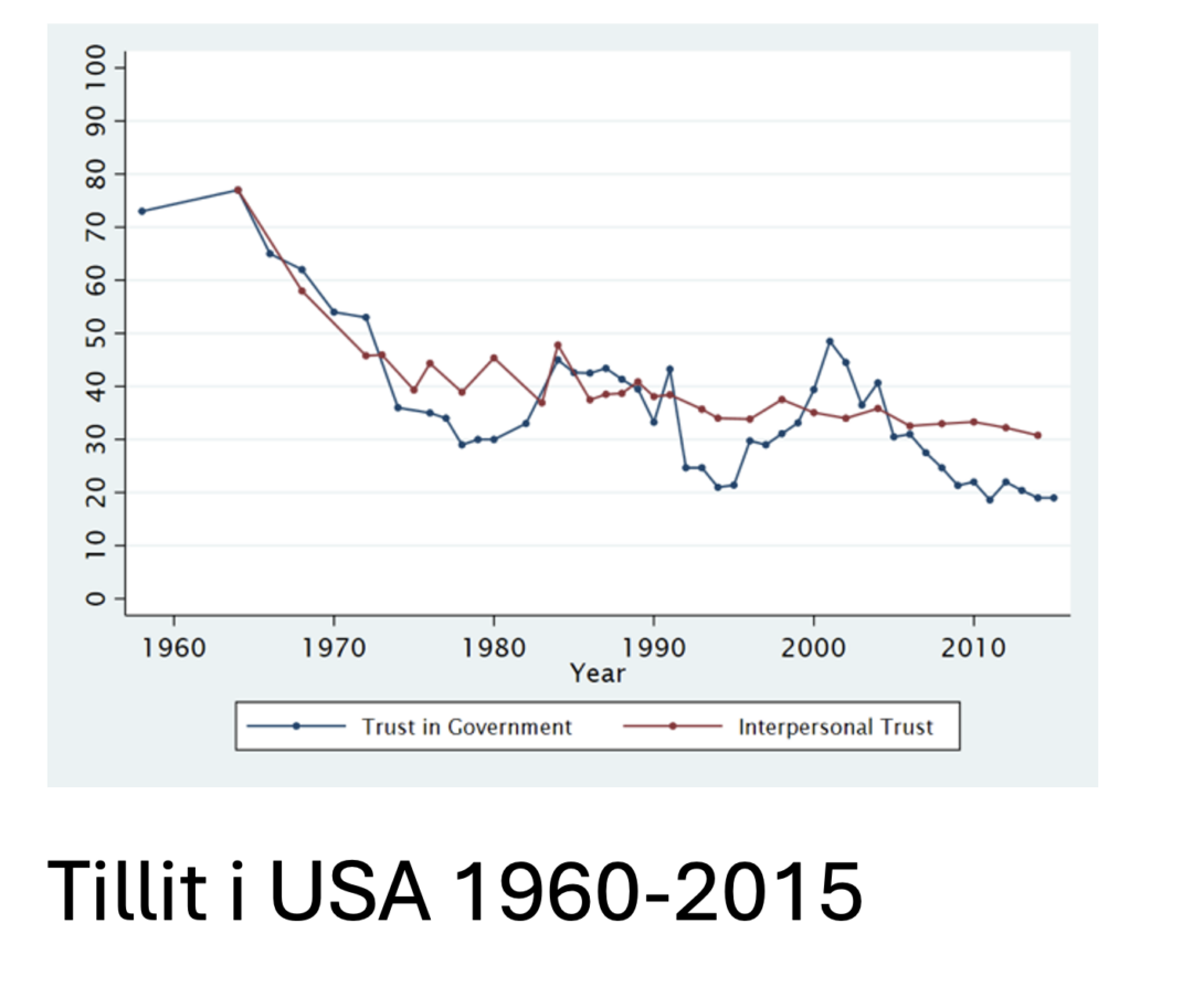Demokrati är ett delikat politiskt system som bygger just på tillit. Vi röstar på partier och politiker för att vi litar på att de ska representera våra åsikter och intressen. Vi litar på att de flesta andra medborgare också följer lagarna och avstår från allsköns oegentliga handlingar (mutor, skattefusk, diskriminering, etc). De nordiska länderna utmärker sig av exceptionellt hög tillit. Så var det också i USA när man började mäta detta i slutet av 1960-talet – omkring 7 av 10 amerikaner uppgav att de ansåg sig i allmänhet kunna lita både på ”andra människor” och på landets offentliga institutioner.