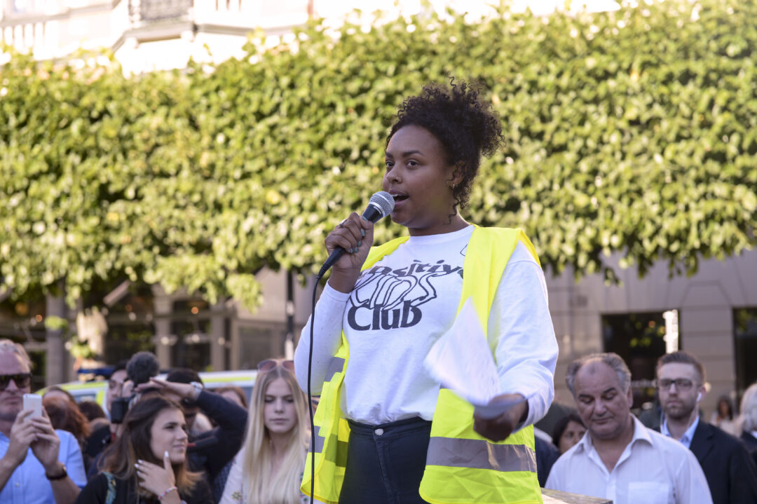 Amie Bramme Sey talar under en demonstration på Norrmalmstorg i Stockholm 2015. Den riktade sig mot att SL upplåter annonsplats åt Sverigedemokraternas kampanj. Foto: Fredrik Sandberg/TT