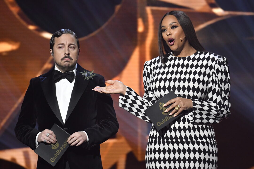Värdparet komikern David Sundin och poddaren Amie Bramme Sey under Guldbaggegalan 2021. Foto: Anders Wiklund/TT