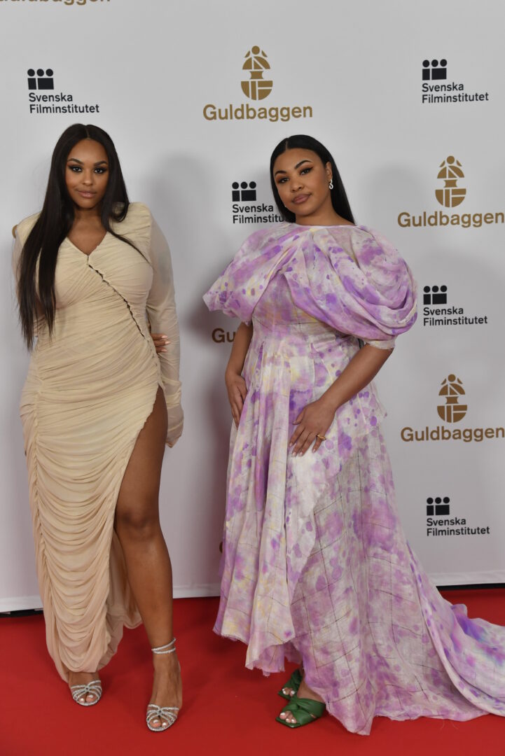 Programledaren och poddaren Amie Bramme Sey med Fanna Ndow Norrby anländer till Guldbaggegalan 2021 på Annexet i Stockholm. Foto: Anders Wiklund/TT.