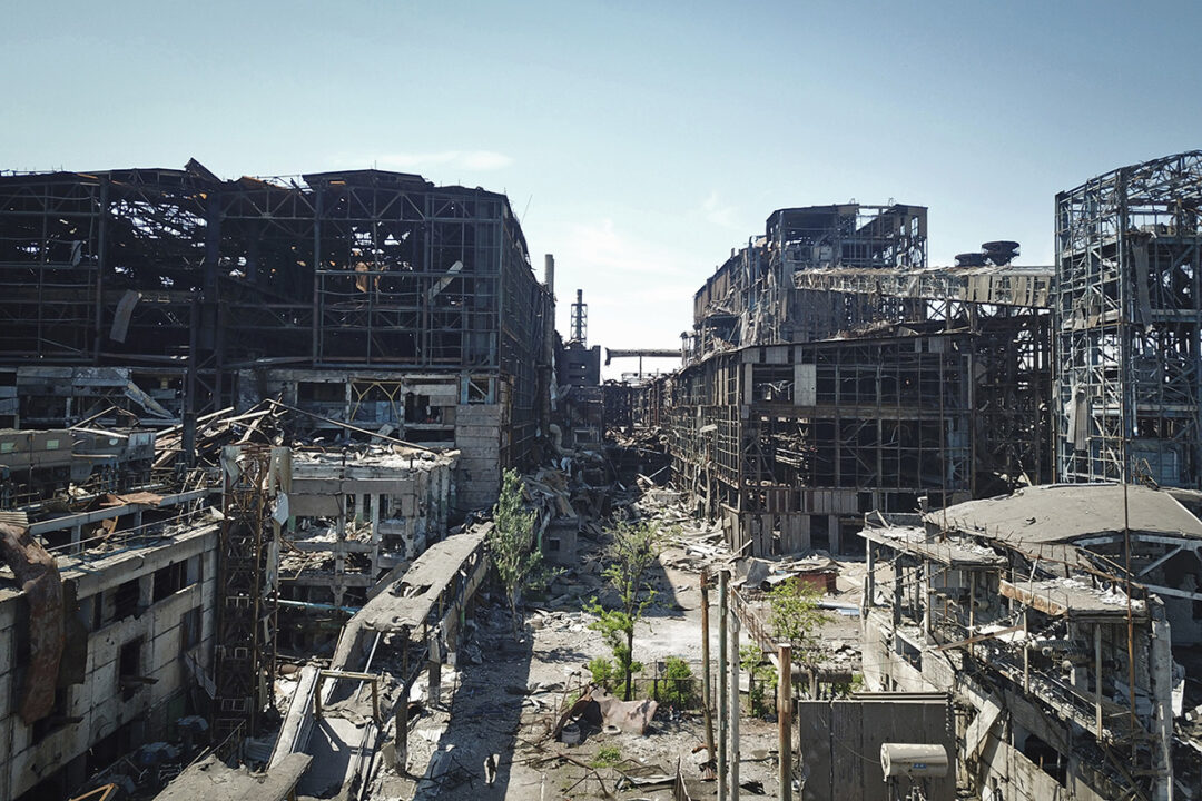 Toppbild: bilvrak vid det förstörda stålverket i Mariupol i östra Ukraina.