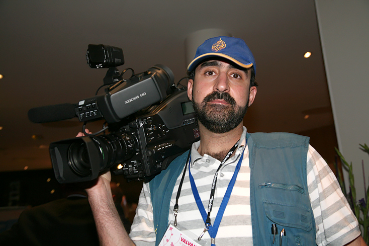 Ammar al-Hamdan kopplar upp sig på Skype och filmar med sin Iphone 4G och kommenterar samtidigt bilderna på Al Jazeeras sändning.