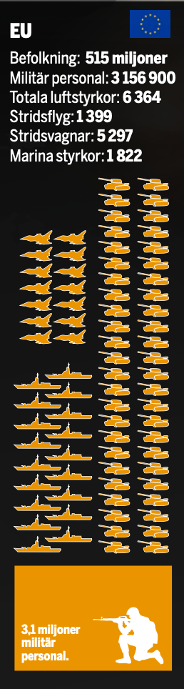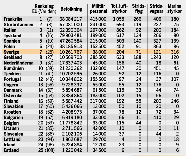 Sajten globalfirepower.com analyserar och rangordnar regelbundet världens militärer. På pappret är Frankrike EU:s starkaste militärmakt, sett till en kombination av bland annat försvarsbudget, och militära styrkor i form av soldater, stridsvagnar och attackflygplan. Storbritannien kommer tvåa, och Sverige rankas som nummer sju i EU. Etta och tvåa globalt är USA respektive Ryssland. Men bara för att ett land har ex antal stridsvagnar på pappret betyder det inte att det har förmågan att möta ett ryskt invasionshot. Stridsvagnarna kan stå i verkstaden eller så kan det saknas utbildad personal för att hantera fordonen.