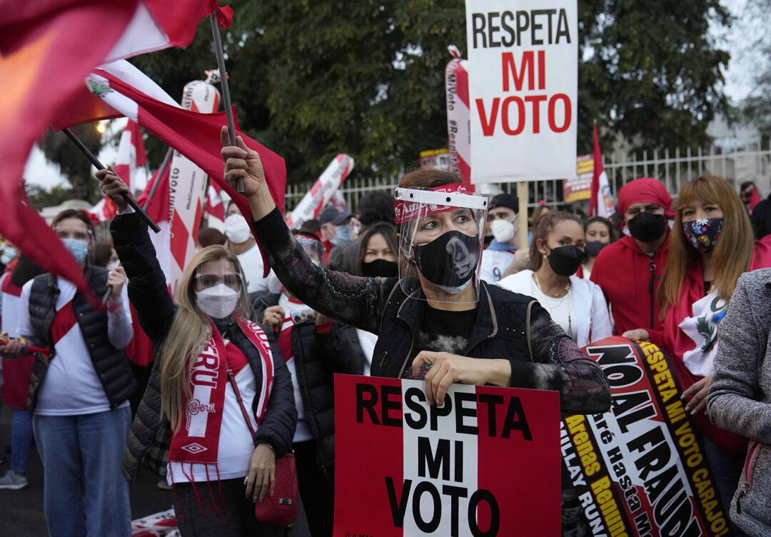 Peru. Juni 2021: Presidentkandidaten Keiko Fujimori och hennes anhängare ifrågasätter valresultatet där Pedro Castillo vann med 50,2 mot 49,8.