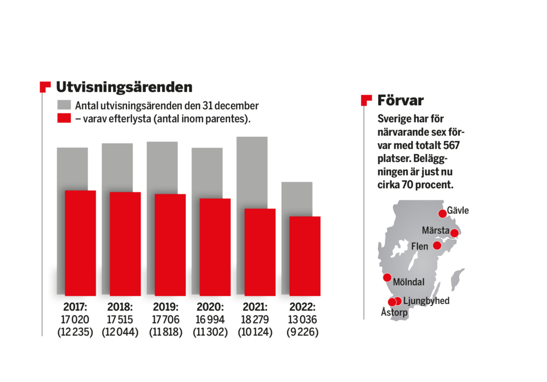 Det går lite si och så med den saken. Vid årsskiftet hade Polismyndigheten 13 036 öppna ärenden som överlämnats från Migrationsverket till polisen gällande personer som har fått avslag på sin ansökan om uppehållstillstånd, men där verket bedömde att det finns behov av polisiära insatser för att verkställa utvisningen. Av dessa var drygt 9 000 efterlysta.