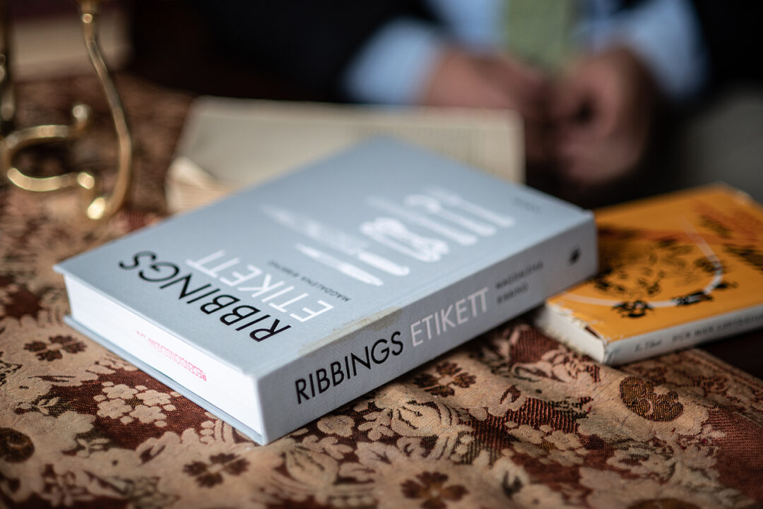 Jag får sätta mig i det angränsande biblioteket, där några urdruckna avec-glas fortfarande står framme efter helgen. Edward Blom plockar med sig dem in i köket och jag blir lämnad ensam en stund. I en av bokhyllorna står en hel rad med etikettsböcker. Bland annat flera av det stora oraklet på området de senaste åren, den numera bortgångna Magdalena Ribbing.