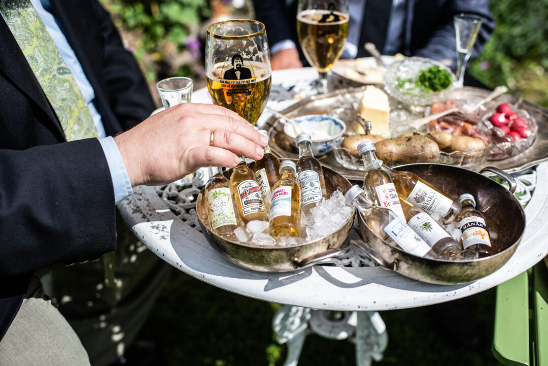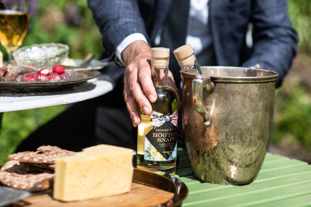 Väl ute i trädgården möts vi av ett avskalat men vackert dukat midsommarbord framför huset. Till vår glädje tittar solen fram och den ser ut att komma hålla sig framme en längre stund. I den glittrande isen i ishinken ligger en mängd olika snapsflaskor. Bredvid står Edward Bloms egen snaps. En film av imma har lagt sig på glaset. Ett par sillsorter står framdukade. Potatisen ångar under några dillkvistar. Smöret har redan börjat mjukna i solen. En fluga vill sätta sig på Västerbottensosten men viftas reflexmässigt bort av Edward mitt under en utläggning om hur man häller upp öl.