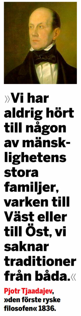 Svaret finns i den ryska historien, i idéer om den nationella identiteten som formulerades av filosofer och författare i mitten av 1800-talet. Den mest brännande frågan på den intellektuella dagordningen var vid denna tid just Rysslands förhållande till Europa och europeiska värderingar. Diskussionen fördes i decennier och ledde till en djup splittring mellan dem som såg Rysslands enda framkomliga väg i ett närmande till Väst och dem som betonade landets historiska särart. Denna splittring klyver också dagens ryska samhälle.