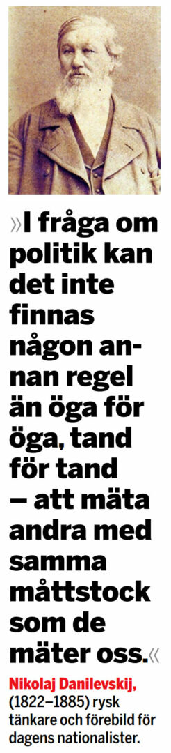 Under den västorienterade Alexander II:s regeringstid, då livegenskapen avskaffades, hamnade slavofilernas idéer efter hand i skymundan. Men det fanns tänkare som spann vidare på dem. En var Nikolaj Danilevskij, som av dagens ryska nationalister hyllas som en lysande förebild. För honom var målet en stark rysk stat och en slavisk federation under rysk överhöghet. Förhållan-det mellan stater och nationer måste av nödvändighet baseras på egenintresse: »I fråga om politik kan det inte finnas någon annan regel än öga för öga, tand för tand – att mäta andra med samma måttstock som de mäter oss.«
