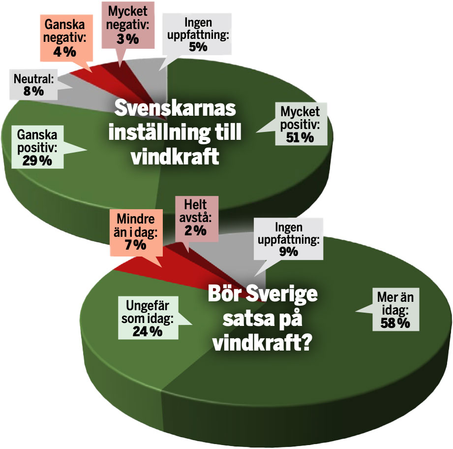 Svenskarna är i allmänhet positiva till vindkraften som sådan, åtminstone så länge de själva slipper se den. Enligt SOM-institutets rapport Åsikter om energi och kärnkraft från i våras är 73 procent av svenskarna positivt inställda till vindkraft, vilket kan jämföras med att 32 procent uppger att de är positivt inställda till kärnkraft. 58 procent av svenskarna anser att vi bör satsa mer på vindkraft än vad vi gör i dag, och endast 9 procent anser att vi bör satsa mindre på vindkraft, alternativt helt avstå från den.
