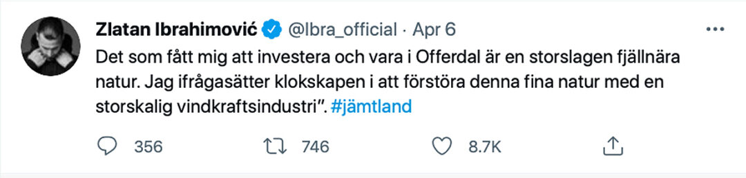 Debatten om en eventuell vindkraftsetablering i Offerdal fick uppmärksamhet långt utanför Krokoms kommun när fotbollsikonen Zlatan Ibrahimovic, själv markägare i trakten, gav sig in i diskussionen via sitt Twitterkonto. Den sjätte april i år twittrade fotbollsspelaren, som annars förfäktar att idrottare bör hålla sig utanför den politiska debatten: