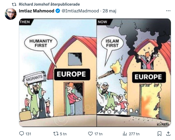 I mitten av september blev Richard Jomshof, SD-topp och ordförande för riksdagens justiteutskott, förhörd och delgiven misstanke för hets mot folkgrupp. Han hade i våras nämligen delat vidare två satirteckningar på medieplattformen X. Den ena visar hur ”Europa” naivt släpper in muslimer i sitt hem, varpå de bränner ner huset. På den andra ses en pakistansk migrant i havet som räddas av en engelsman med båt. Den pakistanske mannen kastar så västerlänningen överbord och håller sedan en åra med texten ”Rape Jihad”. Kvar på båten finns även engelsmannens fru och dotter.